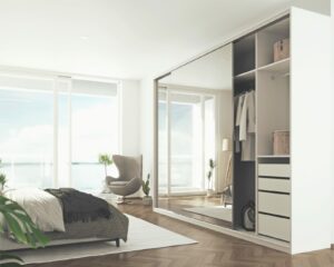 Jos suunnittelet kaapistoa pieneen tai hämärään huoneeseen, kuten eteiseen tai makuuhuoneeseen, harkitse peiliovien käyttöä. Peilipinnat tekevät tilasta välittömästi avaramman ja valoisamman heijastamalla sekä luonnonvaloa että keinovaloa. Sen lisäksi, että ne tuovat huoneeseen syvyyttä, ne toimivat myös käytännöllisenä kokovartalopeilinä, mikä tekee pukeutumisesta vaivattomampaa.