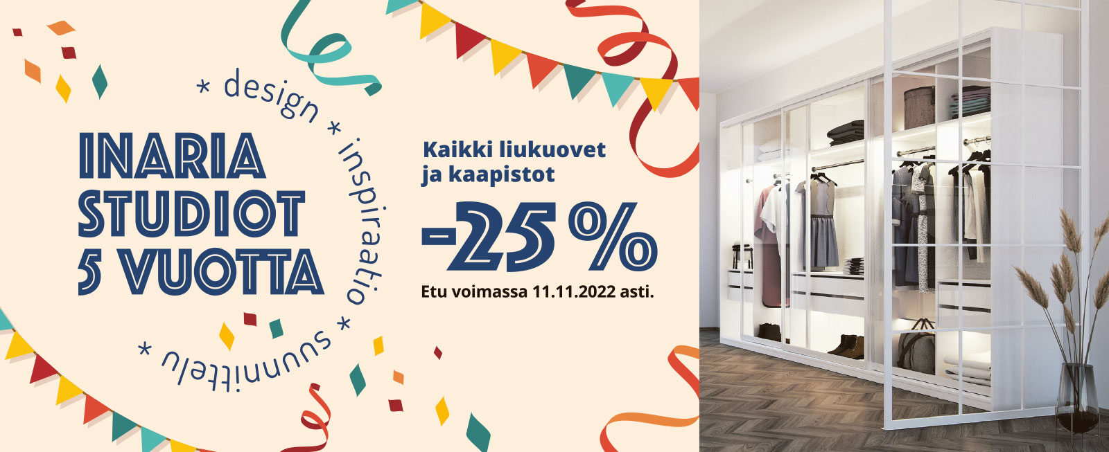 Synttäreiden kunniaksi nyt kaikki liukuovet ja kaapistot -25%.